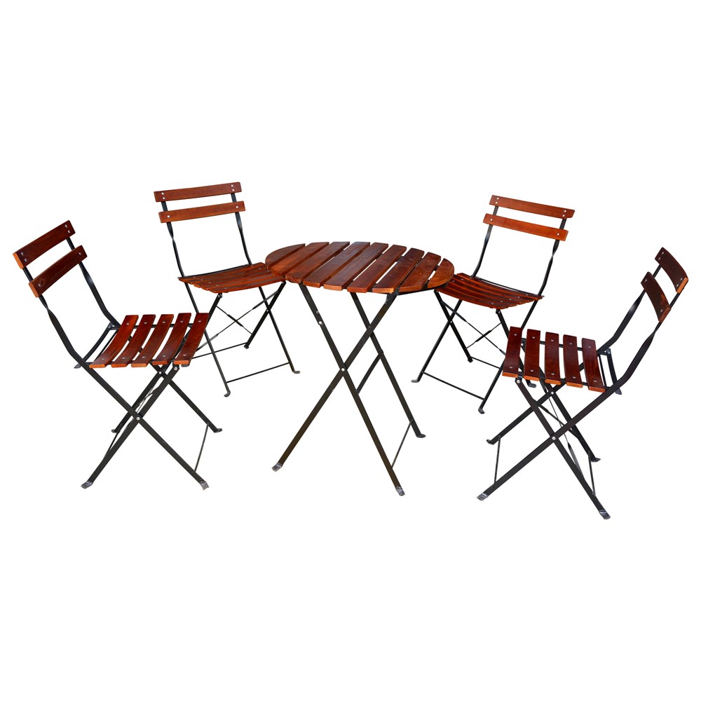 This set made of 4 Chairs (42x35x79 cm) and 1 Table (D.60 x70 cm) with metal structure and from wood spessor of 12 mm (Chair) and spessor of 15 mm (Table). It is ideal for any open environment because it is quite fresh and very pleasant color suitable to be placed in open areas of bars, verandas, terraces, balconies etc. The material component of woods and metal structure is resistant to atmospheric agents, making these Tables highly suitable for small environments.