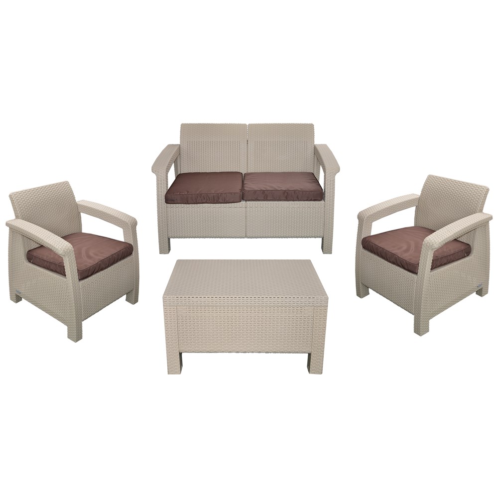 The cappucino color set, 120x82x62 cm in size, is an ideal choice for furnished open areas of bars, patios, terraces, balconies etc,. Plastic material is lightweight and resistant to moisture and atmospheric agents, making this set very convenient for facilities that will furnish. The cappucino color, fits easily with all shades of colors and very well with the green environment. Cushions in dark brown that are part of the set, besides the wonderful vision that will provide a comfortable and relax during your stay.