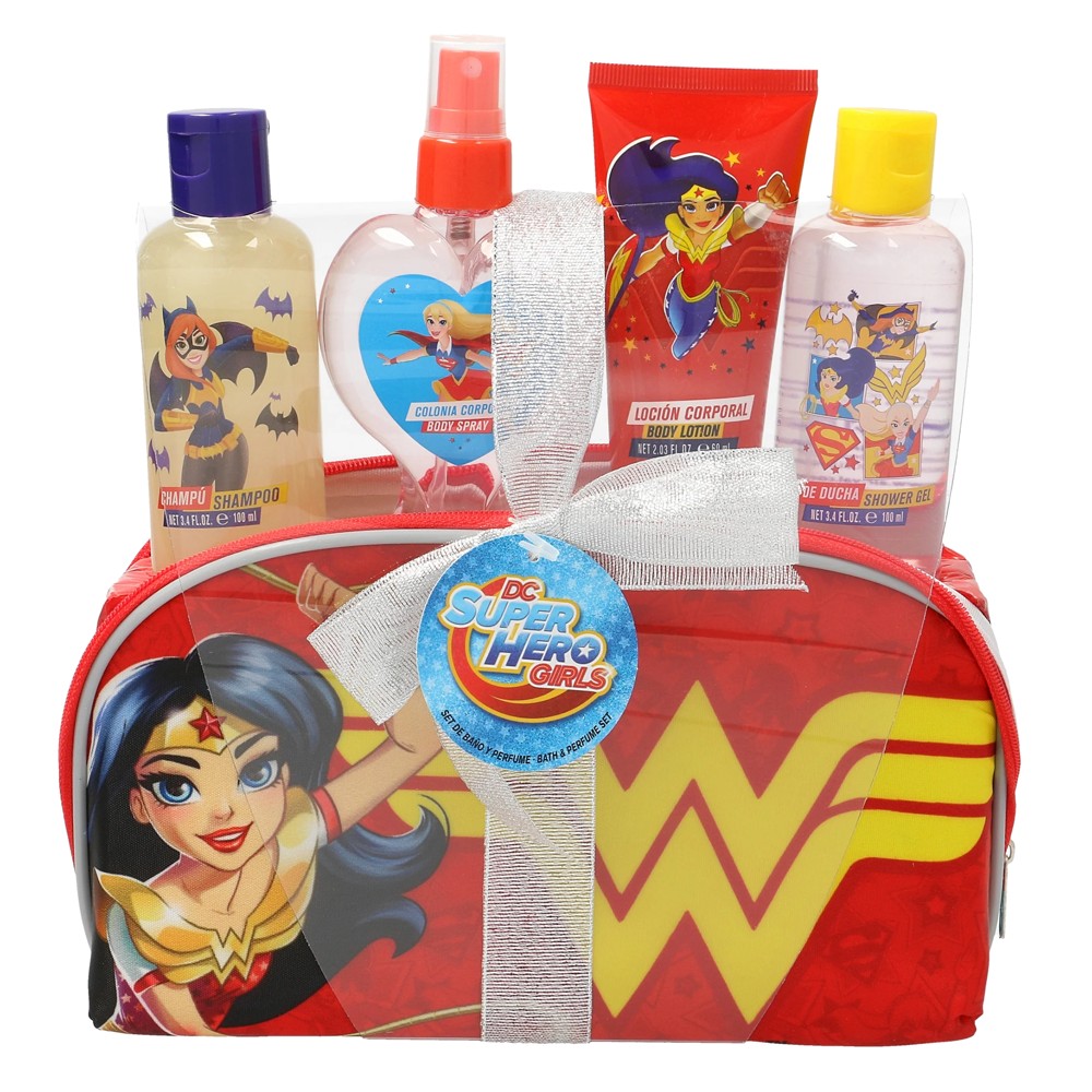 Set for children Superhero girls. The set contains a shower water 120 ml, shower gel 100 ml, a shampoo 100 ml, and a body milk 60 ml. All these are placed in a bag.