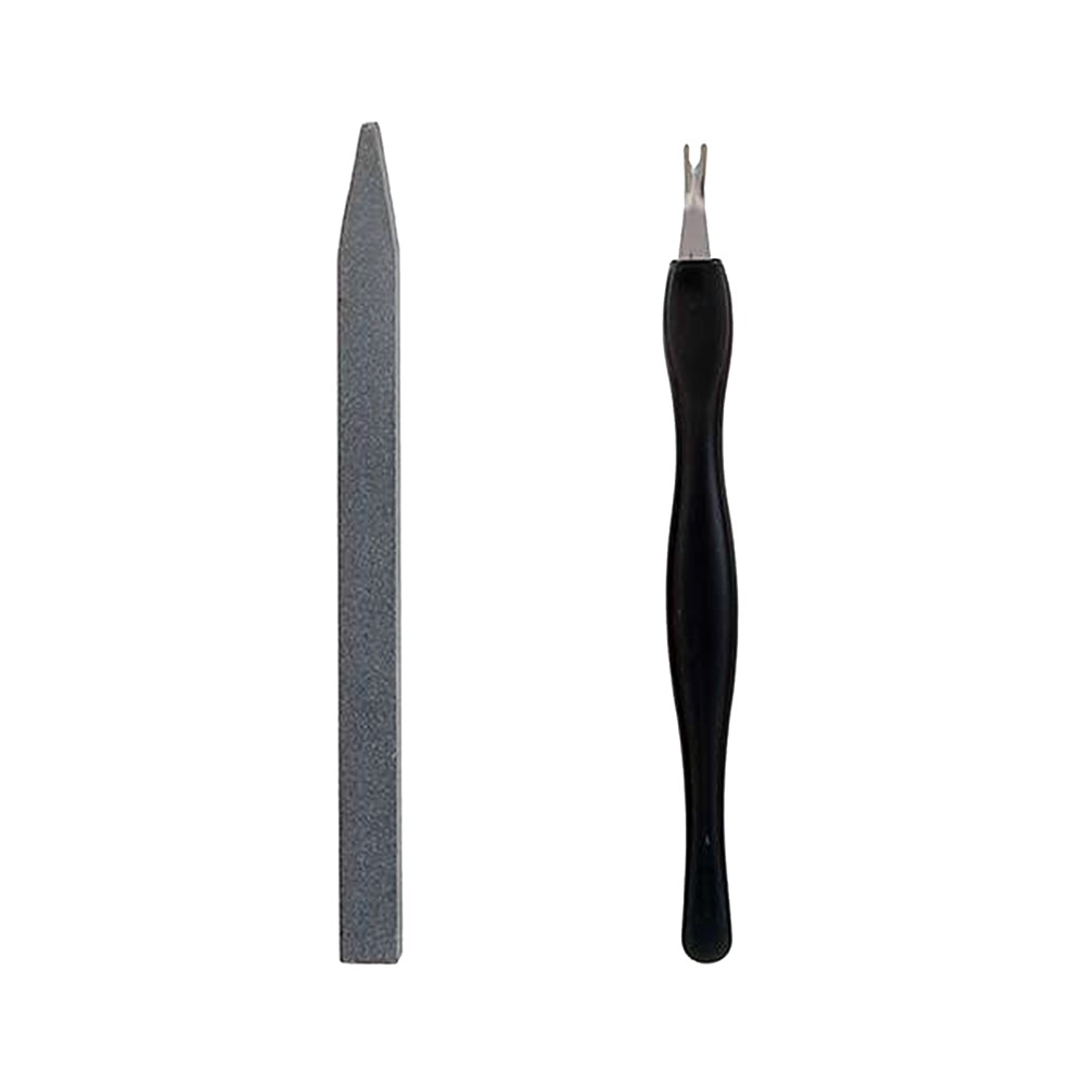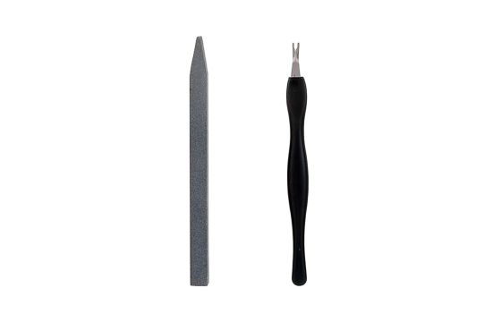 Cuticle trimmer set, which contains the nail file and the cuticle pusher, with resistable stainless steel material, in silver and black color. It can be used for cutting and smoothing the nails, trimming and pushing the cuticles and cleaning the dead skin. This product is small and easily portable.