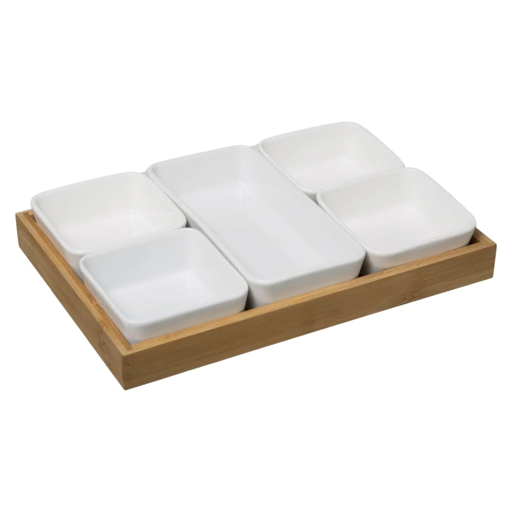 Set of antipasti bowls with trays in a modern design. The tray is made of bamboo material and the 5 bowls are made of porcelain. It can be used as a serving tray - hors d'oeuvre to serve nuts or anything else you want for the dining room, coffee table or buffet.