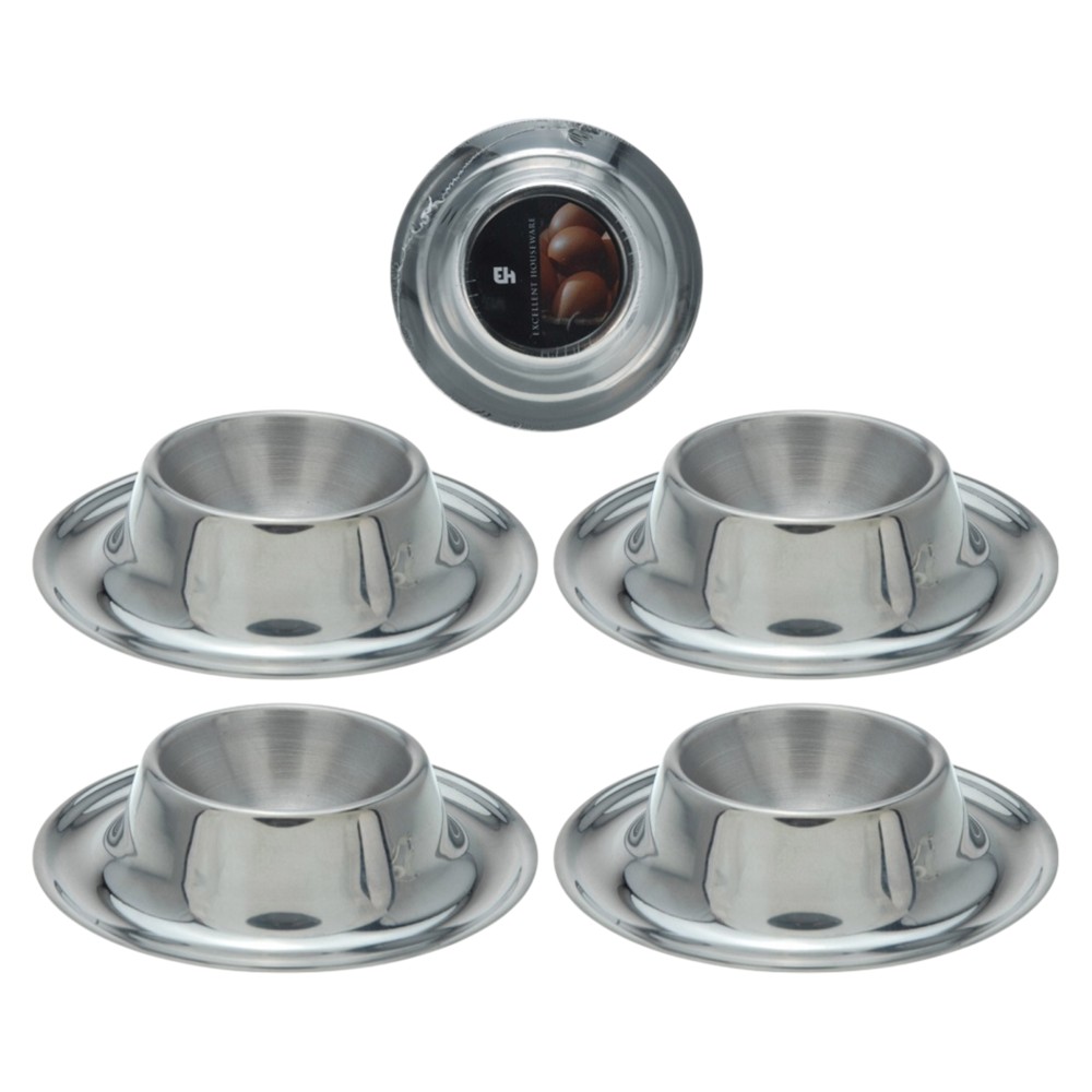 Serve boiled eggs in this stainless steel egg holder. Its base makes it stable and its shape is ideal for standard-sized eggs. It can be used in hotels, restaurants and also in your own homes. It comes as a set for holding four eggs and comes in dimensions 8.5x2cm. Perfect for making egg serving easier and a very elegant kitchen accessory.