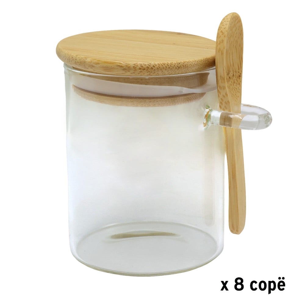 This set of eight jars with bamboo lids combines functionality with natural beauty, bringing an elegant and organic touch to any kitchen. Each transparent glass jar with a diameter of 6.5 cm and a height of 8 cm offers the opportunity to clearly see the contents and organize spices, dried fruits, teas or small ingredients with ease. The natural bamboo lids give it a warm and refined nuance, preserving the freshness and aroma of the products. Practical, durable and with a simple and beautiful design, these jars are small accessories that bring order, style and naturalness to any kitchen shelf.