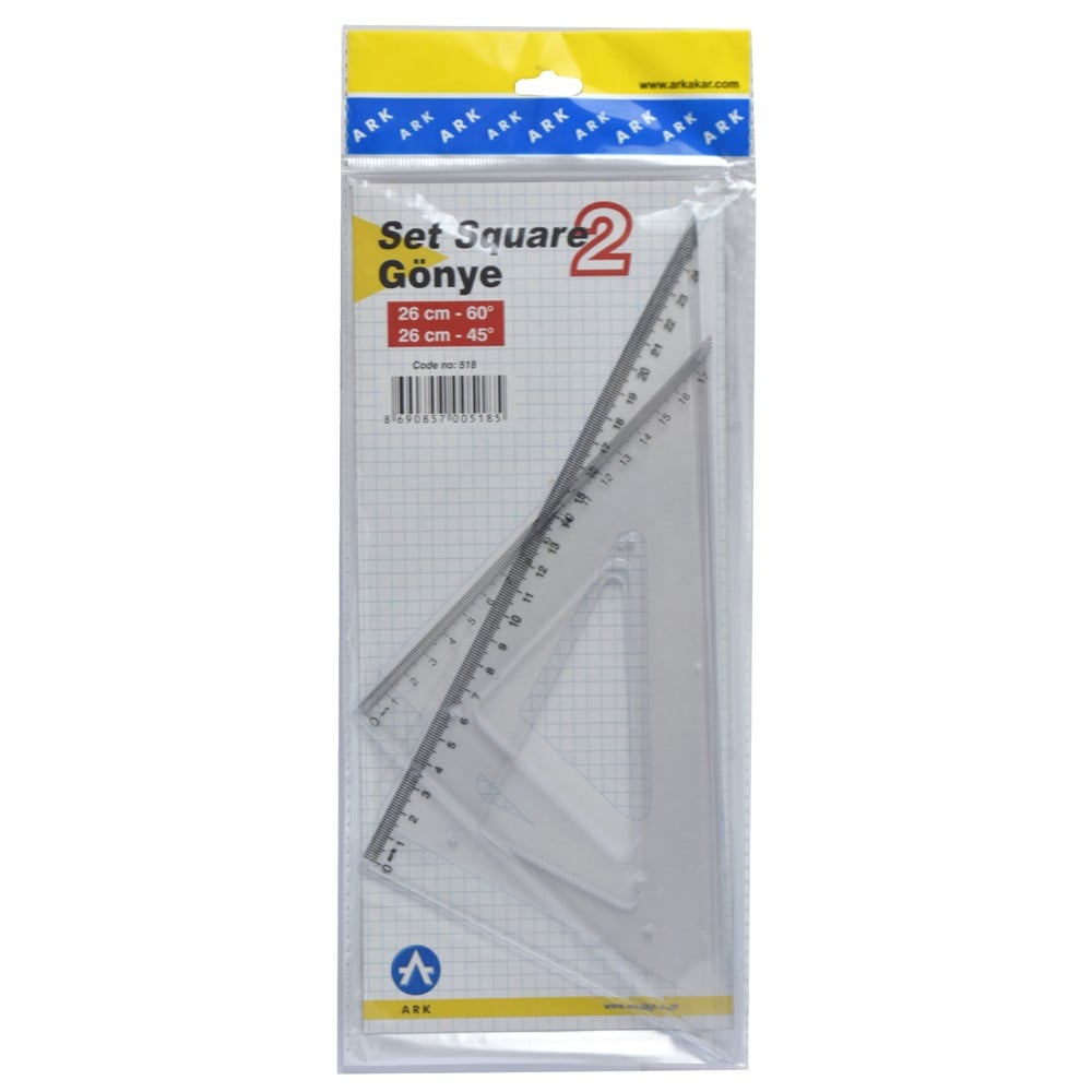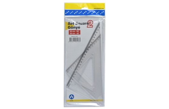 Ruler set, made of plastic material, which contains 2 triangular rulers, in transparent color. They are used for sketching and drawing, and can be used to teach young children about geometric shapes. This product is suitable for use by children over 3 years old and adults, and is practical thanks to its small size.