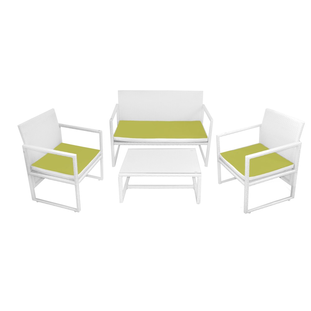 Ratanit set of splice comprising mid tables , two chairs and couch is an ideal choice the furnishing your environment open bars , verandas , terraces , balconies , etc. . The material component of polyethylene ( PE ) is easy and resistant to atmospheric agents making this set very convenient and premises and homes near beaches . Their geometric shapes square of the component parts of this set as the support element , curbs, suprinës the element table and table legs and arms of chairs and sofa with square profile of them bring a modern spirit to your garden . The white color of this set fits easily with all the nuances of color and quite well with the green environment by creating a harmonious contrast between this set and the colors green environment as well as an inviting and relaxing scenery .