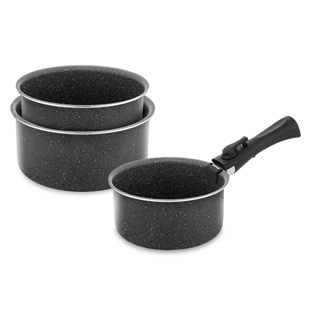 Transform your cooking experience with this revolutionary gray cookware set, designed for maximum efficiency and space-saving. This elegant and functional set, comprising pots with 16 cm, 18 cm, and 20 cm diameters, is the ideal solution for any modern kitchen. The key to this set is its innovative, removable handle. This unique feature allows you to use the pots both on the stovetop and in the oven, and makes them incredibly easy to store since detaching the handle saves valuable space. The flexibility it offers will change how you cook and organize your kitchen. Made from high-quality aluminum and coated with an advanced ceramic non-stick layer, these pots guarantee effortless cooking. Food won't stick, making cleanup a quick and easy task. The ceramic coating is also safe and free of harmful chemicals, enabling you to cook healthier with less oil. The base of the pots is induction-compatible, ensuring uniform and rapid heat distribution across the entire surface. This means even cooking and maximum energy efficiency, regardless of your stovetop type (gas, electric, ceramic, or induction). This cookware set is not just a cooking tool, but an investment in convenience, style, and healthy cooking. Choose this set for a more organized kitchen and an improved cooking experience!