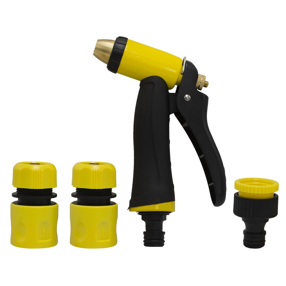 Spraying guns for plants, with appropriate fittings to adapt to standard irrigation pipes and hoses. Made of plastic structure. Supports the grip part with soft rubber, for ease and comfort during watering. Bronze metal, makes it impossible to rust over the years of use. The different reducers enable the adaptation and fixation of this gun in standard irrigation pipes as well as the connection of the cistern-pipe and pipe-gun, with just one click. Ideal for the maintenance and further development of your green space.