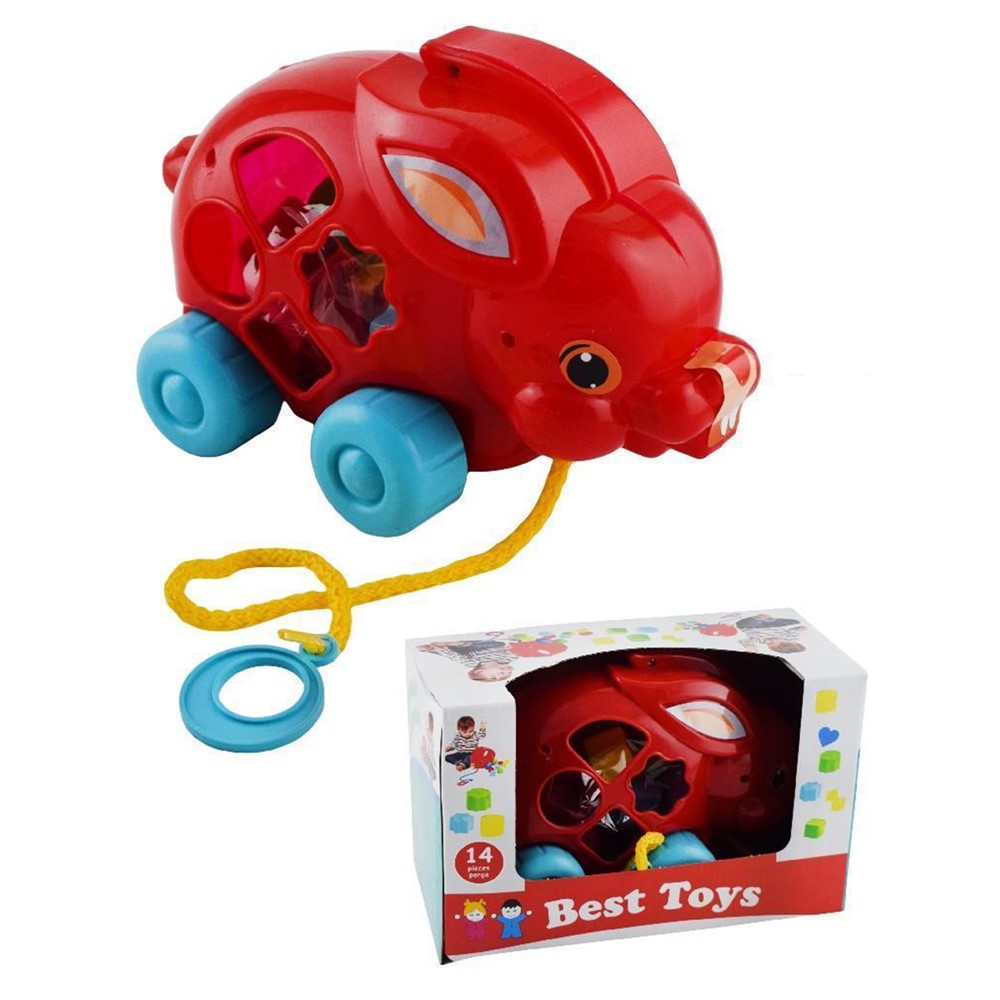 Shape sorter puzzle for kids, in rabbit shape, made of plastic material, equipped with shapes in assorted colors and with wheels. This toy helps young children to recognize geometric shapes and different colors, it helps to develop fine motor skills of hands and fingers and it stimulates the development of perceptual skills in children. The constituent material and paint have no content that can be toxic or harmful for children and the product is certified for safety in use. This product is suitable for use by children aged 0-2 years.