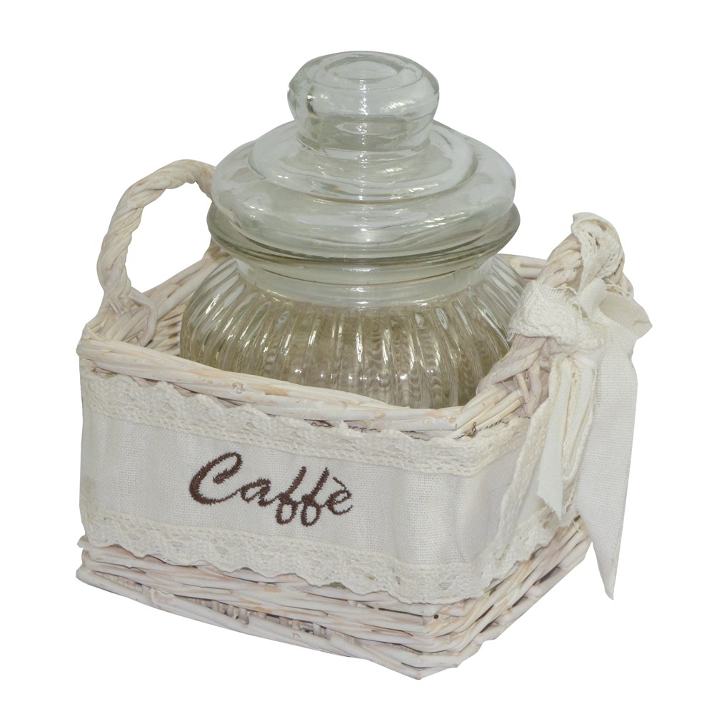 Coffee basket with natural wicker with 2 holders, a more airtight jar to 16.5cm height. with decorative cotton fabric on the part of the outside makes it more functional and decorative baskets for home or bar / restaurant.