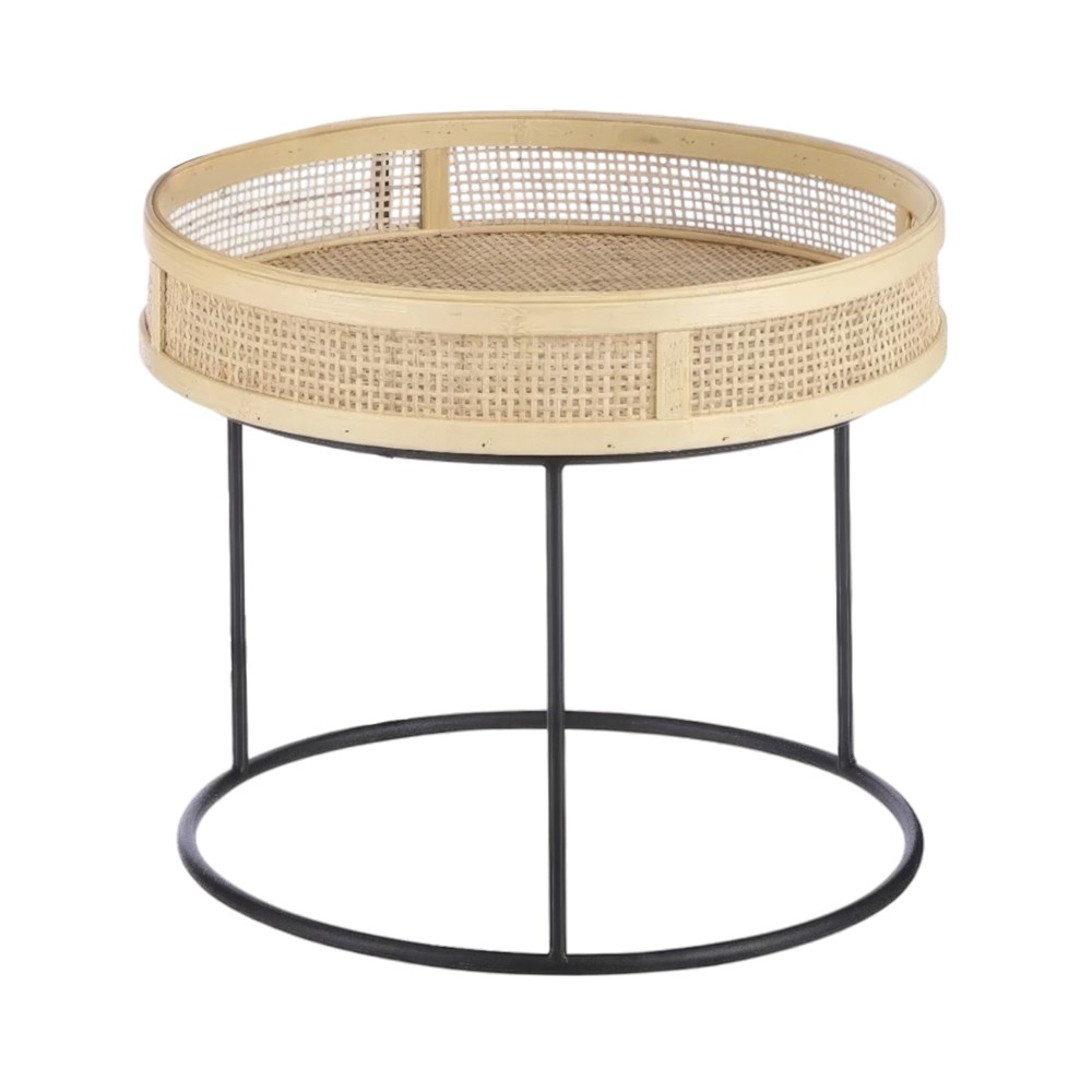 The "Leandro" side table is a decorative and functional element designed to add style and adaptability to different environments of your home. The table is constructed with a combination of metal and bamboo. The metal structure provides stability and durability, while the bamboo surface offers a warm and natural look. It can be used as a side table to place various objects such as vases of flowers, books, or drinks, also it can serve as a decorative object to add style and elegance to the environment.