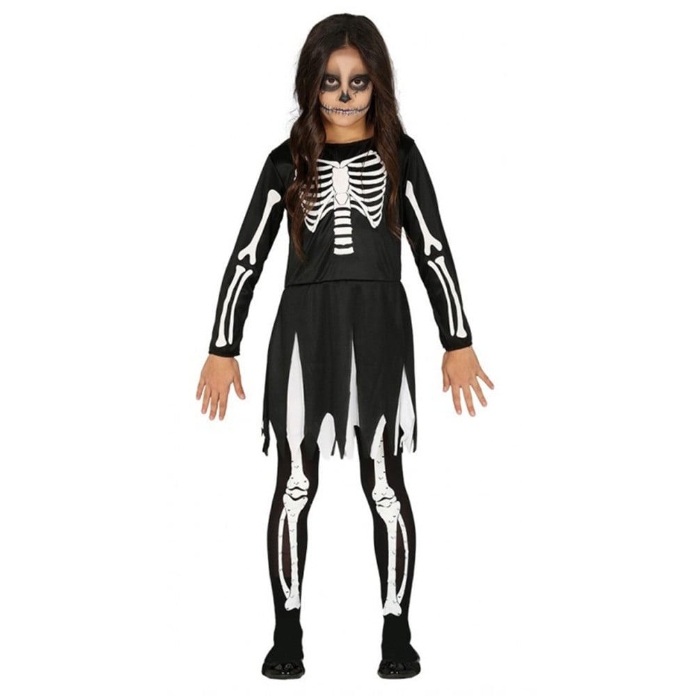 Skeleton costume for children, made of polyester material, in black and white colors. The component material is soft to the touch and does not cause skin irritation. This product is suitable for use by children aged 10-12 years old, from 146 cm tall up to 152 cm tall. The costume includes the top and the pants.