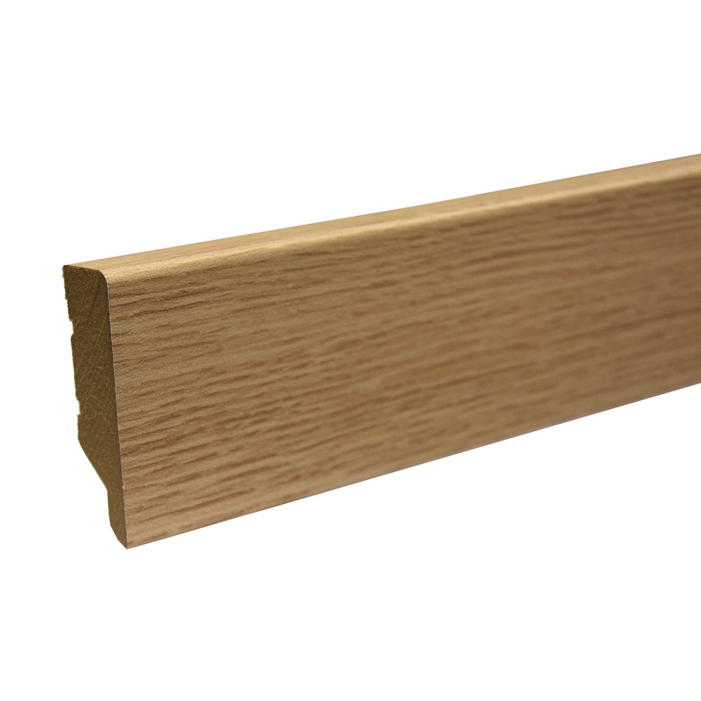 MDF skirting board perfectly covers the expansion joint of the floor. It is covered with wood-patterned foil and is secured with the mounting parts provided. Matching corners and edgings, skirting boards available.