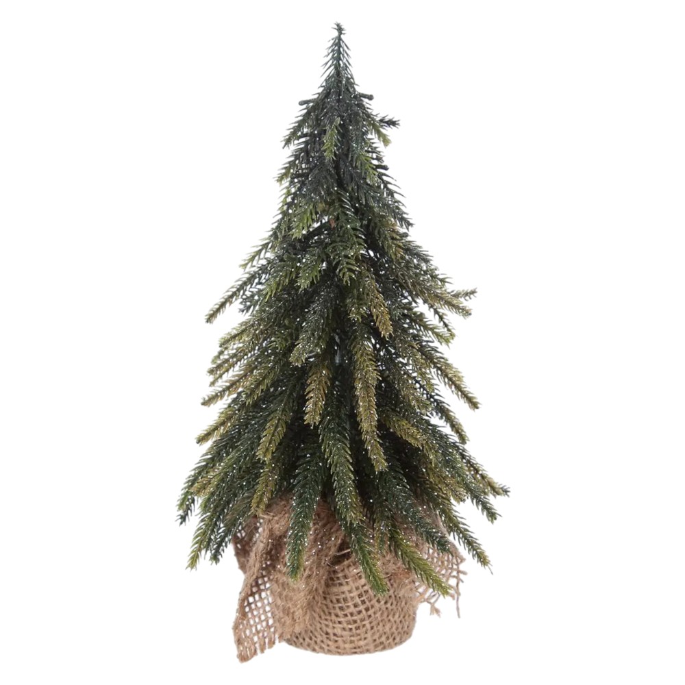 Small decorative tree, made of polyethylene material, with jute fiber base, with dimensions of 27 cm in height, in green color. It can be used to decorate table surfaces, in various interior environments during the Christmas and New Year holidays. This product is suitable for non-professional use, in home environments, and for professional use, by event organizing companies.