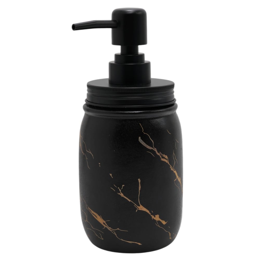 Liquid soap dispenser "Marmolite B" produced in high quality ceramic in black color with gold colored water and black button, this dispenser will add style and practicality to your bathroom. Dimensions, height 18 cm x diameter 6.5 cm.