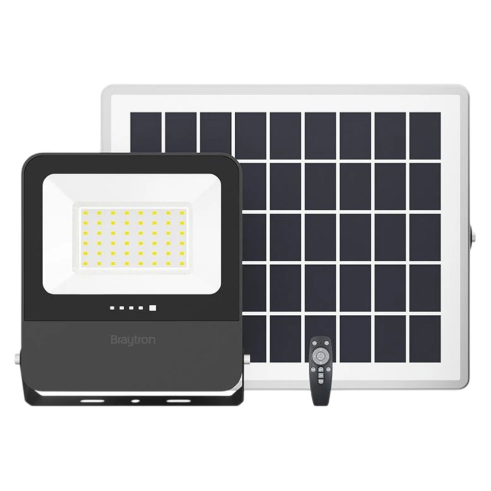 LED floodlight with solar panel, power 30/100W, luminous flux 1200 lumens and adjustable light temperature 3000–6400K. Provides up to 12 hours of operation after charging and has IP65 protection, ideal for outdoor lighting without the need for a connection to the electrical network.