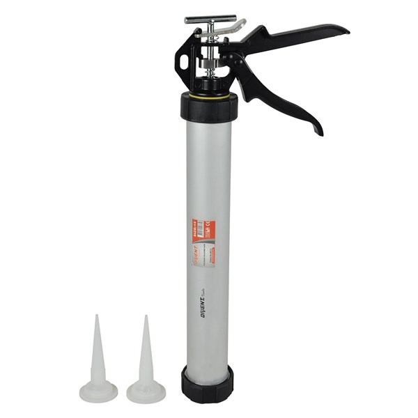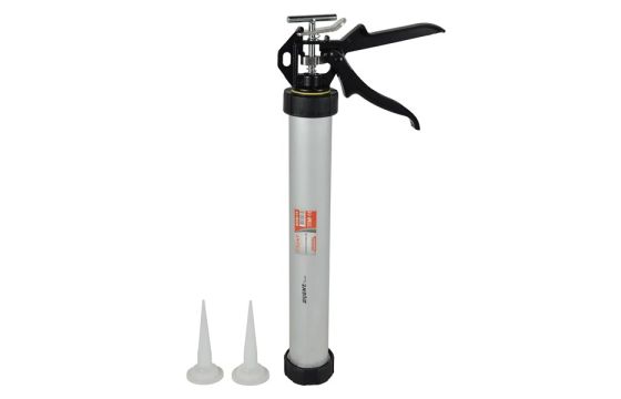 The tool is lightweight with a high thrust ratio for dispensing thin to thick materials packaged in any size bucket. Material is drawn from the pail directly into the barrel of the gun.