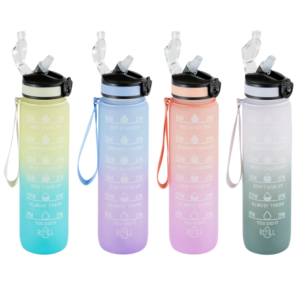 This sporty water bottle is made of durable plastic and comes in multicolored designs, giving it an energetic and modern look. With a capacity of 1 L and dimensions of 8 cm in diameter and 28 cm in height, it is perfect for use at the gym, during sports activities, or while traveling. The plastic material ensures lightness, durability, and easy cleaning, making this bottle a practical and functional choice to keep you hydrated throughout the day.