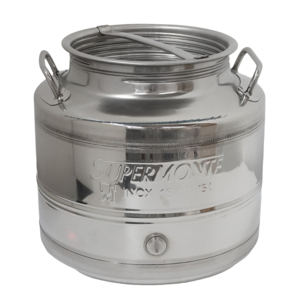 Stainless steel canister for oil, capacity 15 liters. Constructed of stainless steel material for durability and high strength, this canister is ideal for storing and transporting oils.
