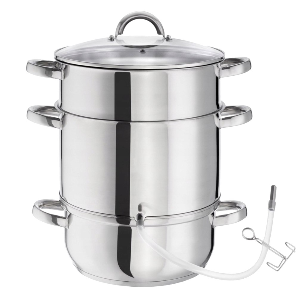 L'estrattore di frutta al vapore, realizzato in acciaio inossidabile, viene utilizzato per la produzione di succhi di frutta Bio pastorizzati. Il vapore generato nel contenitore inferiore dell'acqua deporta tra frutta e verdura, estraendo il meglio dei loro valori nutritivi. Allo stesso tempo il liquido esce pastorizzato e può essere conservato a lungo in bottiglie di vetro.