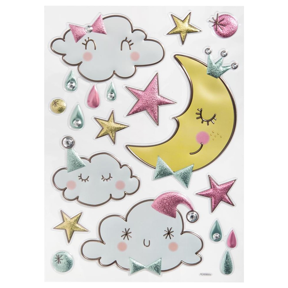Stickers for children, made of polyvinyl chloride (PVC) material, with dimensions of 21x30 cm, with multicolored design and with an adhesive layer on the back side. The stickers can be used to decorate the premises of kindergartens and nurseries, as well as children's bedrooms, and can be glued on the surfaces of walls, various furniture, doors, etc.