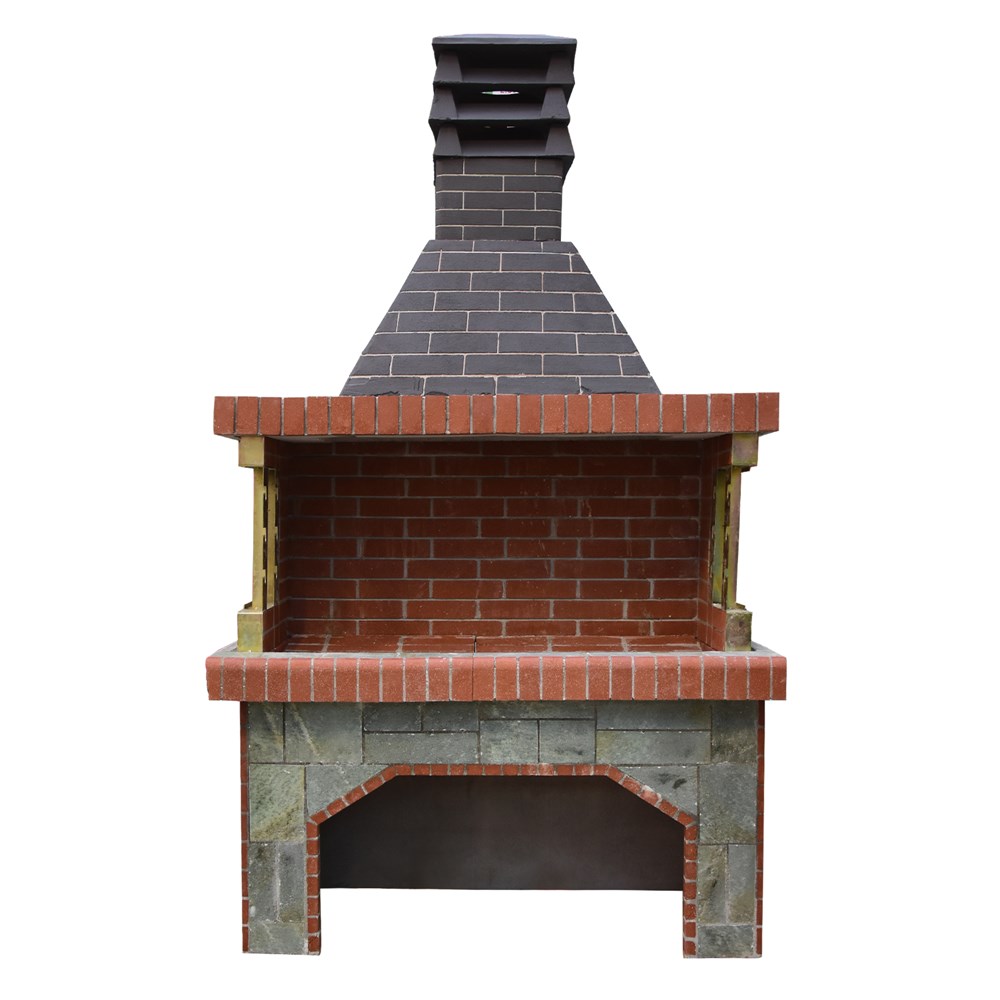 Constructed of concrete, treated with refractory mortar and finished with stone decor. Equipped with 3 height positions to place the skewer rods. The barbecue has enough space to roast chickens, lambs, etc. Assembly required.