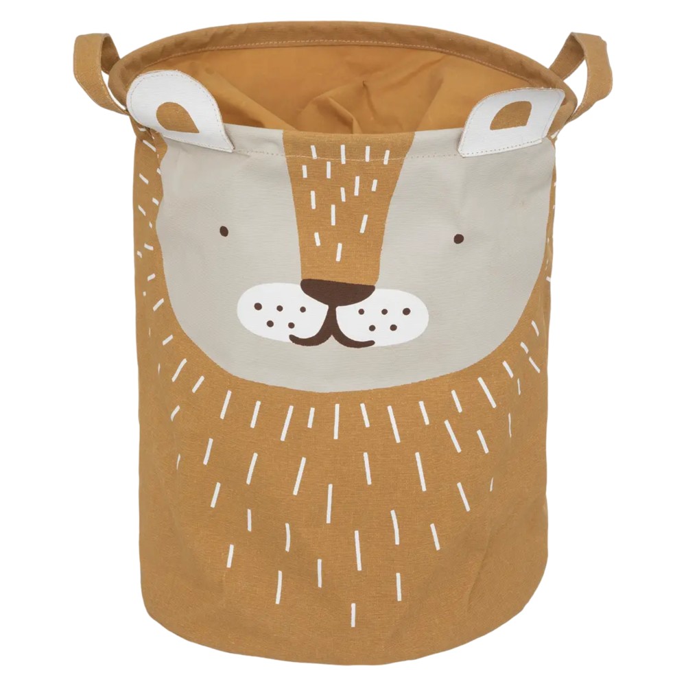Storage bin, made of polyester material, size 32 cm, Lion design, mustard color. It is used for storing and storing various items, clothes, children's toys, magazines or other accessories, helping to optimally organize different spaces. This product is suitable for use in bedrooms or children's rooms.