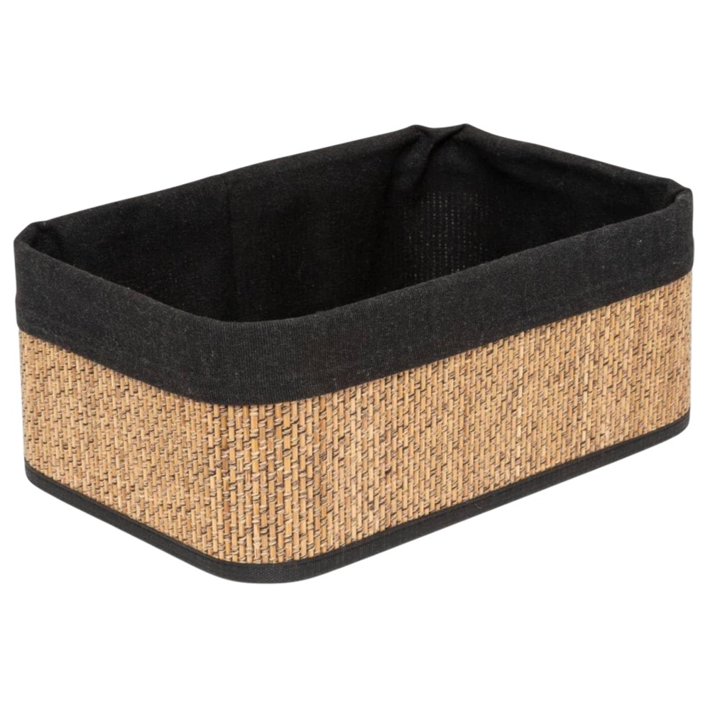 Storage basket in size L, made from a combination of natural straw and black fabric. This basket offers an elegant and rustic look that easily fits into any home or office setting. With dimensions of 31x21xH12.5 cm, it is ideal for organizing small items, accessories, cosmetics, toys, or office supplies.