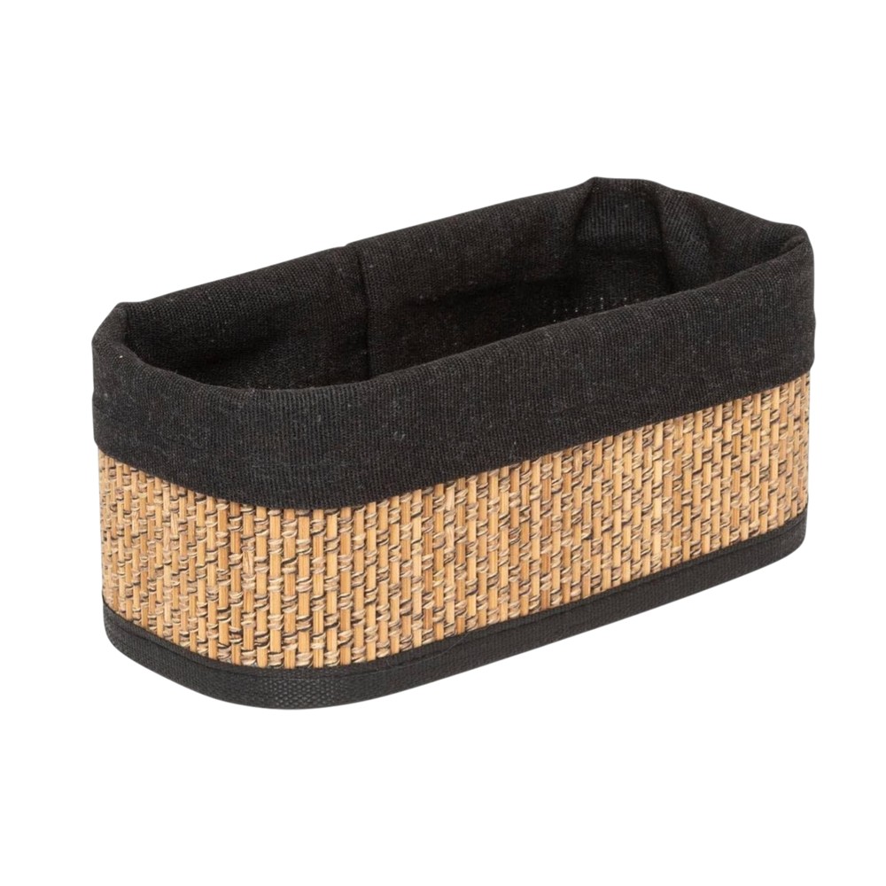 Storage basket in size S, made from a combination of natural straw and black fabric. This basket offers an elegant and rustic look that easily fits into any home or office setting. With dimensions of 20x10.4xH8cm, it is ideal for organizing small items, accessories, cosmetics, toys, or office supplies.
