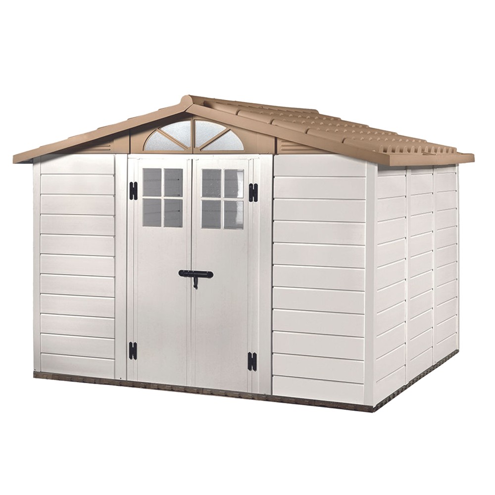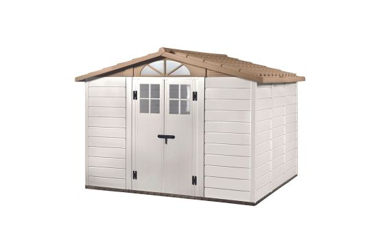 The Garofalo PVC shed, thanks to its compact size, is perfect for both your garden and your porch for storing garden tools, the shed with PVC material is very easy to install, resistant to bad weather and UV rays, it has the floor included and requires no maintenance. The door can be locked and the house can be cleaned very easily, the PVC material of the house can be painted and has 70 kg/m2 resistance to snow load, dimensions 309 x 261 x 225 cm, and weight 219 kg, color white - beige .
