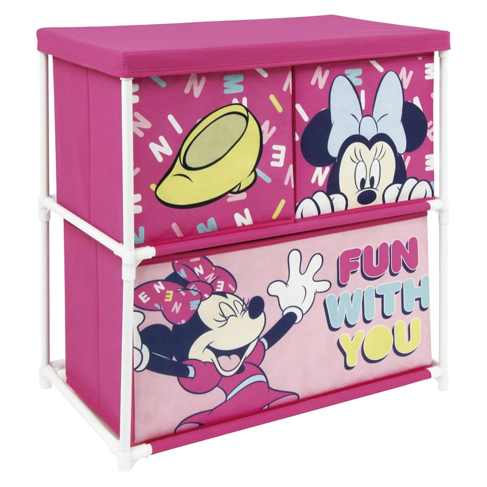 Storage for children's room with Disney Minnie Mouse design and size 53x30x60 cm, which serves as storage as well as decoration. Made of polyester material and fully movable plastic structure. Easy to clean and assemble. It consists of four drawers. Modern and attractive design for children.
