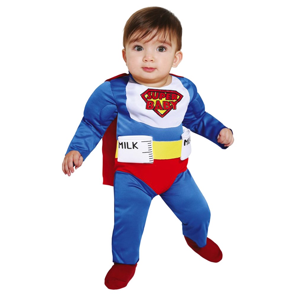 Baby suit with Superbaby, made of anti-allergic polyester material. The dress consists of 1 jumpsuit, 1 belt and 1 red cape. The dress is suitable for ages 6-12 months.