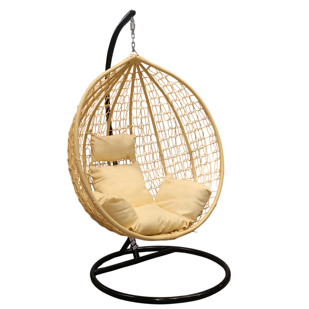 Swing with metal structure and PE rattan elements, with overall dimensions H200 cm and basket L115xW107xD66 cm. The black metal structure ensures durability and stability, while the PE rattan material offers a natural look and resistance to weather conditions. The white seat provides comfort when sitting, while the beige basket makes the swing elegant and harmonious with the environment. The design combines functionality, comfort and contemporary aesthetics, making it suitable for yards, gardens or outdoor recreational spaces.