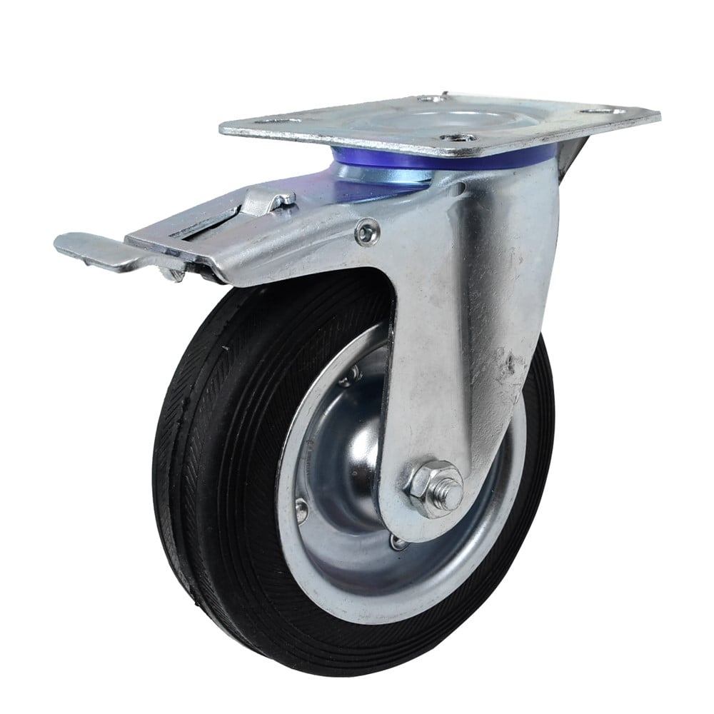The wheels in this series are suitable for use on all kinds of service equipment. with 360° round, with brake, metal plate easy to fix, Double ball bearing swivel head, dust protection, Pressed sheet steel rim, rubber with polyamide bush, Electro galvanized against corrosion -20°C to + 60°C