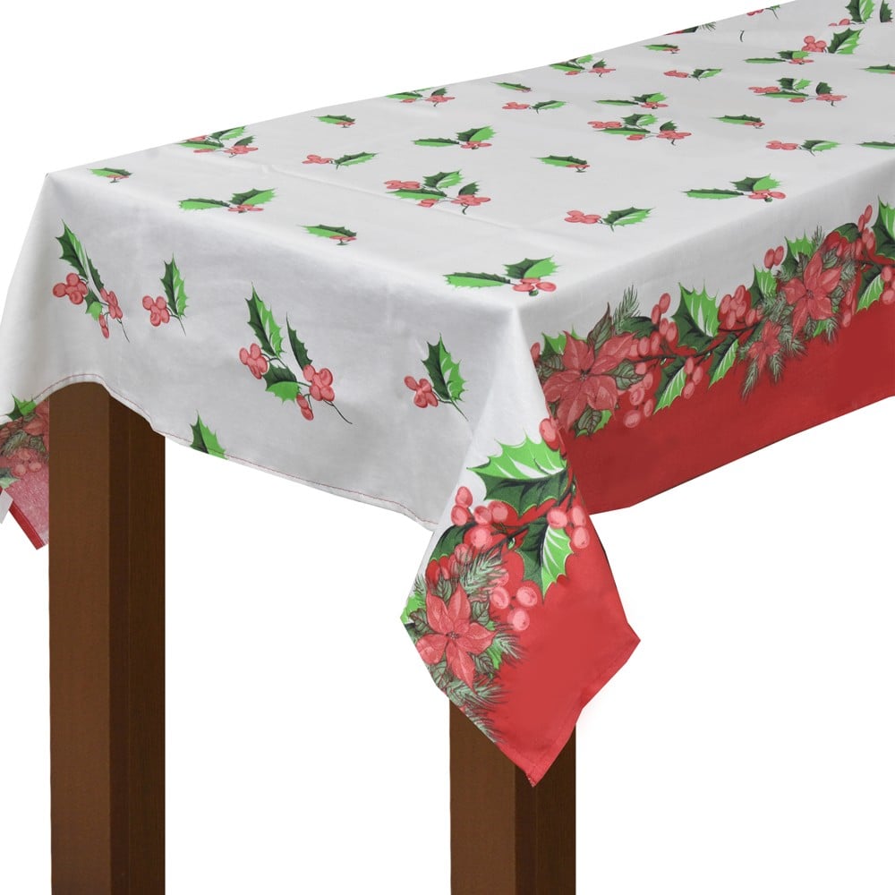 Rectangular tablecloth, made of polyester material, with Christmas design. The component material is resistant to washing, does not absorb fat and does not hold wrinkles, which makes it easier to wash and iron. It is mainly used in domestic environments, for holidays such as Christmas and New Year.