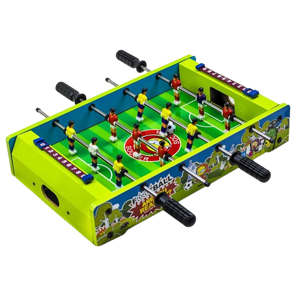 Table football game for children, made of plastic, in black and green. This toy can be easily placed on any surface, thanks to its dimensions. The constituent material and the paint with which this game table is made do not contain toxic or harmful substances for children and the product is certified for safety in use. This product is suitable for use by children over 6 years of age.