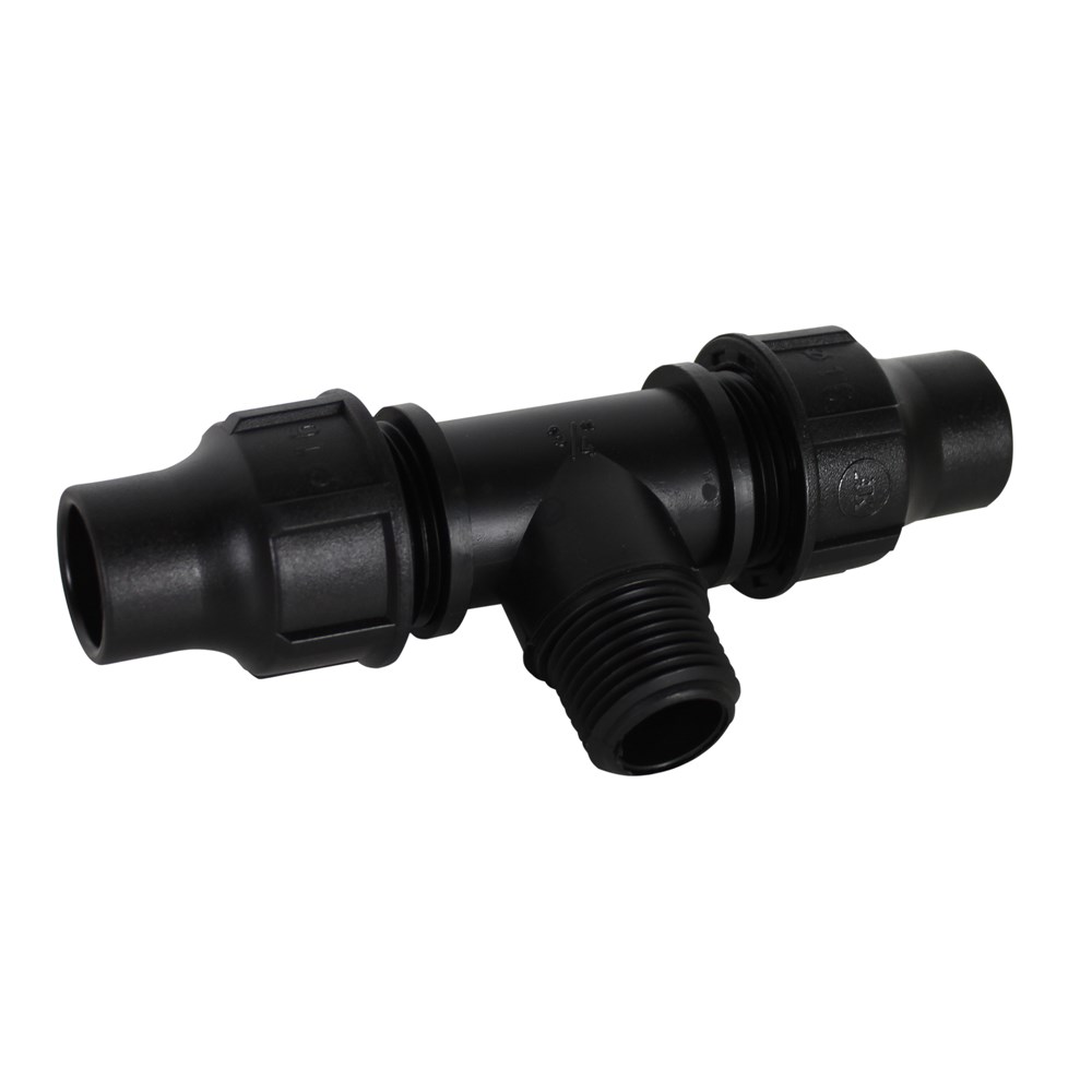 Tee with faucet of PE 16x1/2"x16 mm male with angle 90°. Used to installations angular water supply infrastructure lines, in irrigation and agricul, etc. This tee enables network branching 90° angle. This tee connect LDPE pipe Ø 16 with other fittings by fillet, for joining the fillet recommend tu use teflon whiles pipe connect whith tee in mechanically with faucet. Manufactured with European standards, resistant to corrosive materials designed to withstand pressure up to 6 Bar.
