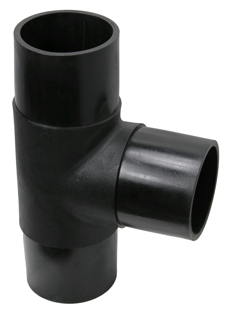 Tee HDPE Ø 125mm with angle 90° used widely today in Europe for angular lines installations of water supply infrastructure and lines for the transport of natural gas. The Tee mounted by the method Butt-fusion. Tee enables network branching 90° angle. For welding HDPE pipe with tee used welding heat machinery which makes it possible merger of tee pages and pipe and through pressure enables their union. Manufactured with European standards, resistant to corrosive materials, high resistance to deformation of land and resistant to pressure up to 10 Bar.