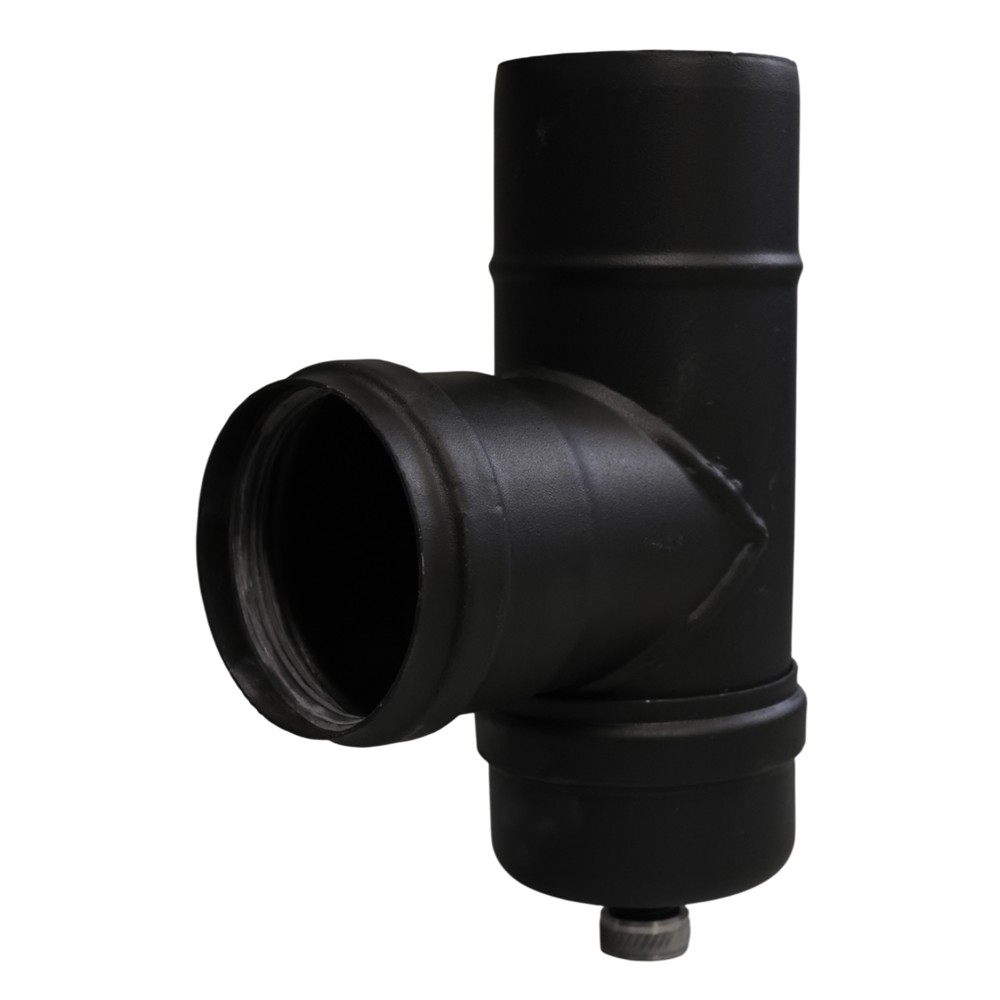 Made from heavy-duty, high-thickness steel welded with laser technology, coated inside and outside with porcelain enamel. Thickness: 1.5 mm. Using the TERM process, it ensures color durability and resistance against acidic fumes from stove exhausts. Equipped with a silicone gasket and finished in matte black. CE certified according to EN 1856-2 and EN 1443 standards, featuring pressure class P1, temperature resistance T200, and corrosion resistance class V2