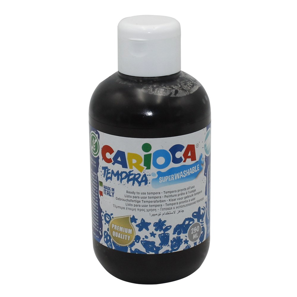 Tempera paint for children, in 250 ml package made of plastic material, in black color, with non-toxic composition, which does not cause skin irritation. The paint is used by children in kindergartens and schools, for painting or for coloring other artworks, and it is suitable for application on canvas, cardboard or thick sheets of paper. This product is suitable for use by children over 3 years old.
