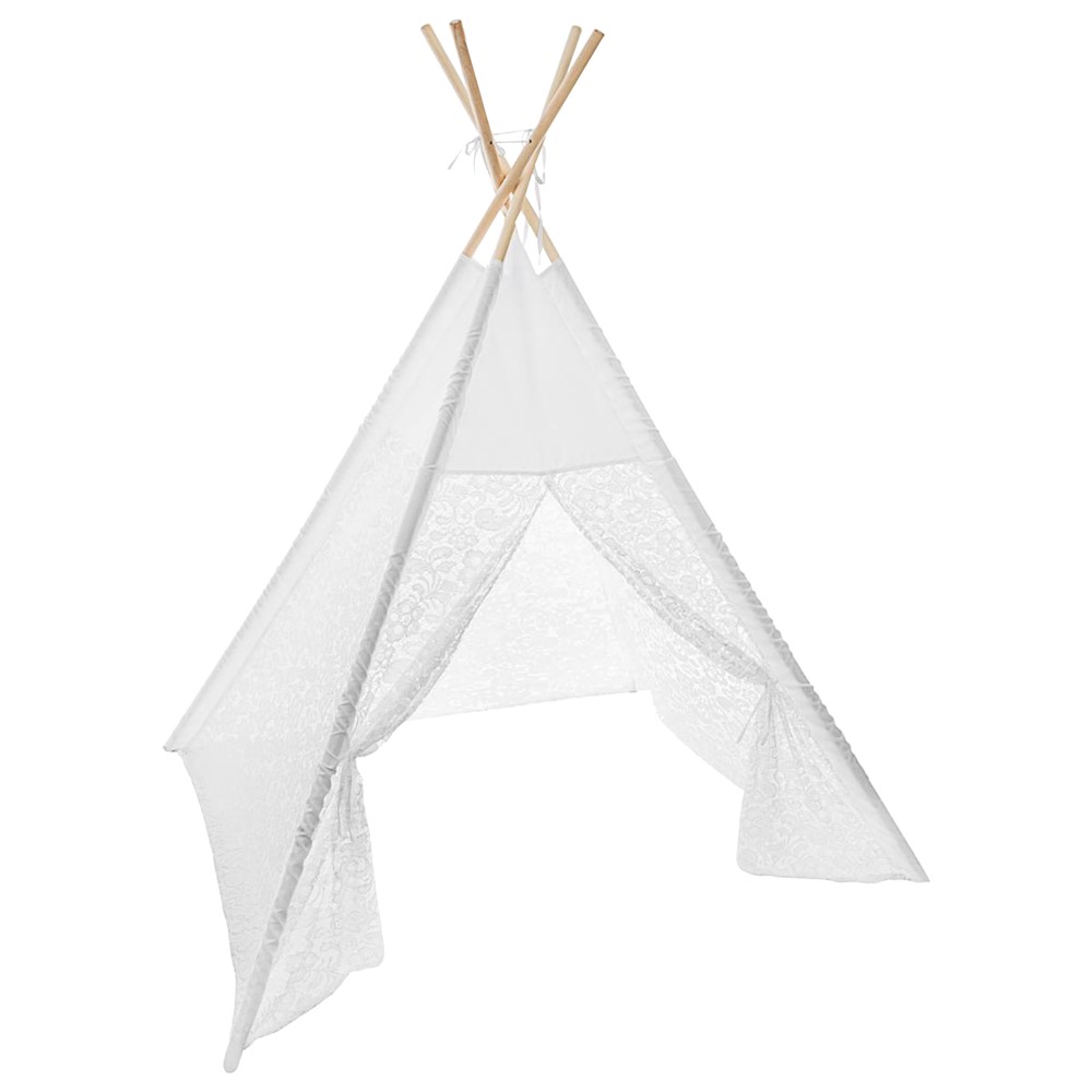 Tent tepe 160x120x160 cm. Made of polyester lace material and poplar sticks to provide a safer plinth. The tent has a gray star design which is adored by children. The tent is suitable for use as a home decoration or as a place where children can hide. White color