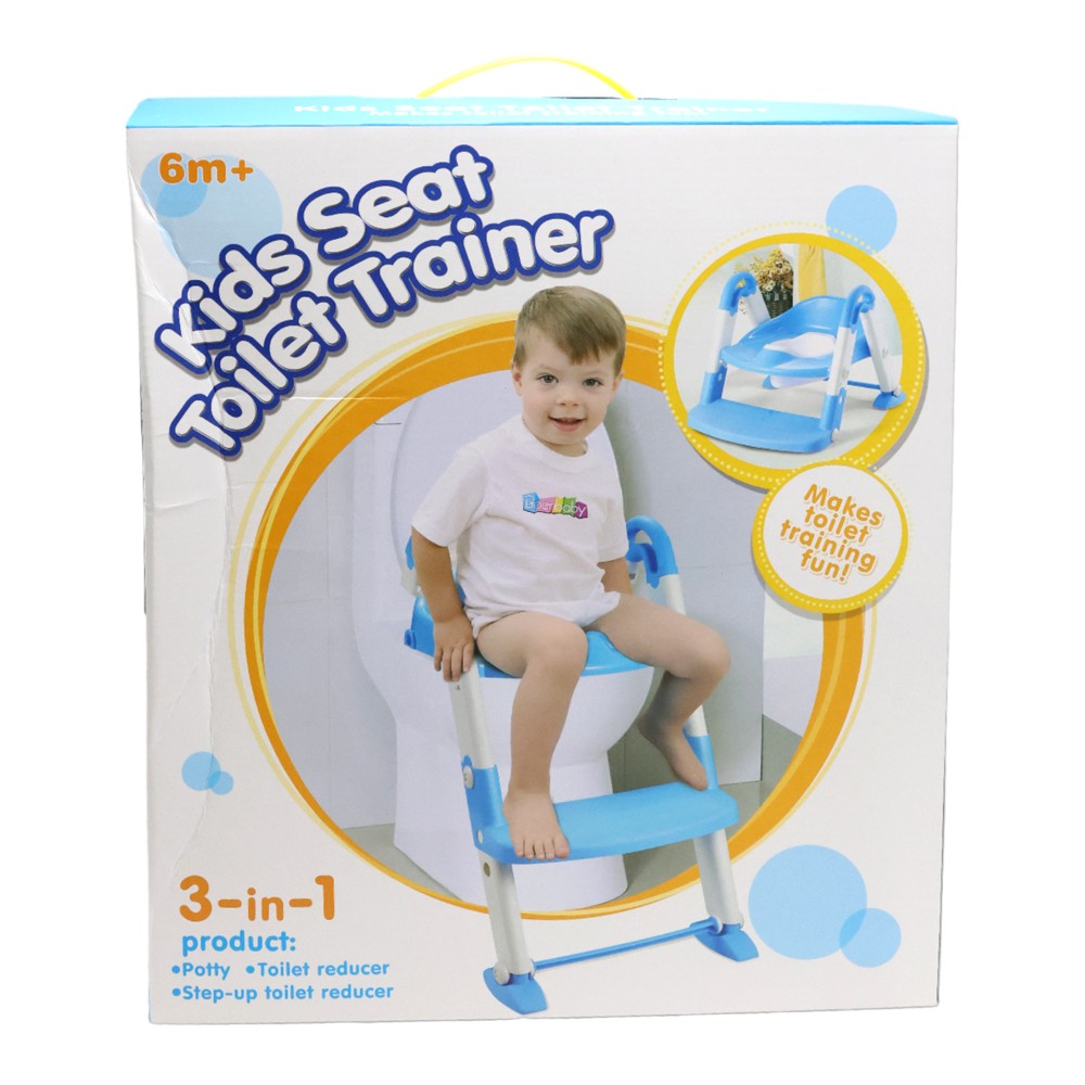The toilet adapter is made of plastic and has a functional design. It has an integrated ladder that makes it easier for children to reach the toilet. Its size is about 21x38x42 cm, making it suitable for small children. This toilet adapter helps children learn to use the toilet on their own, providing a safe and pleasant environment for this important process in their development. It comes in blue or pink.