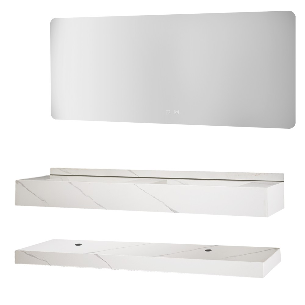 Modern, practical and resistant, these are the features of the "Corcovado" set. Consisting of an upper unit with two integrated basins, a lower unit and a mirror with LED lighting. The furniture is designed with moisture resistant sintered stone. The white color with marble effect has a very elegant look. The furniture is mounted on the wall, where it is not only contemporary looking but also practical, facilitating cleaning. The LED mirror is equipped with a touch button. Dimensions of the upper furniture : height 15 cm x width 150 cm x depth 50 cm. Dimensions of the lower furniture : height 8 cm x width 150 cm x depth 50 cm. Mirror dimensions : height 70 cm x width 150 cm.