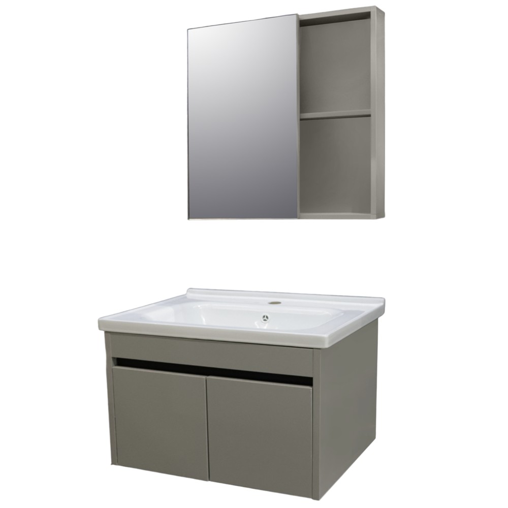 This wall-mounted bathroom vanity set is made of aluminium honeycomb, offering a durable and moisture-resistant structure. With dimensions of W 80 cm x D 46 cm, this set is ideal for compact spaces, providing both functionality and aesthetic appeal. The accompanying mirror measures W 80 cm x D 11 cm x H 60 cm and is designed to seamlessly integrate with the cabinet, creating a clean and organized appearance. The wall-mounted design saves floor space and facilitates easy cleaning beneath the cabinet, contributing to a tidier and more efficient bathroom environment.