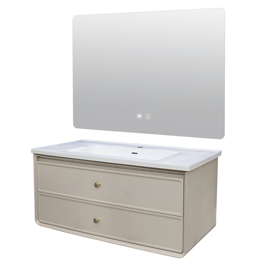 This wall-mounted bathroom furniture set is made of plywood, offering a durable and moisture-resistant structure. Measuring W 78 cm x D 49 cm x H 43 cm and in a cream color, this set is suitable for any space, offering functionality and aesthetics. The mirror measures W 75 cm x H 70 cm, and is designed to integrate seamlessly with the cabinet, creating a clean and organized look. This wall-mounted design saves space and makes it easier to clean the area under the cabinet, contributing to a cleaner and tidier bathroom environment.