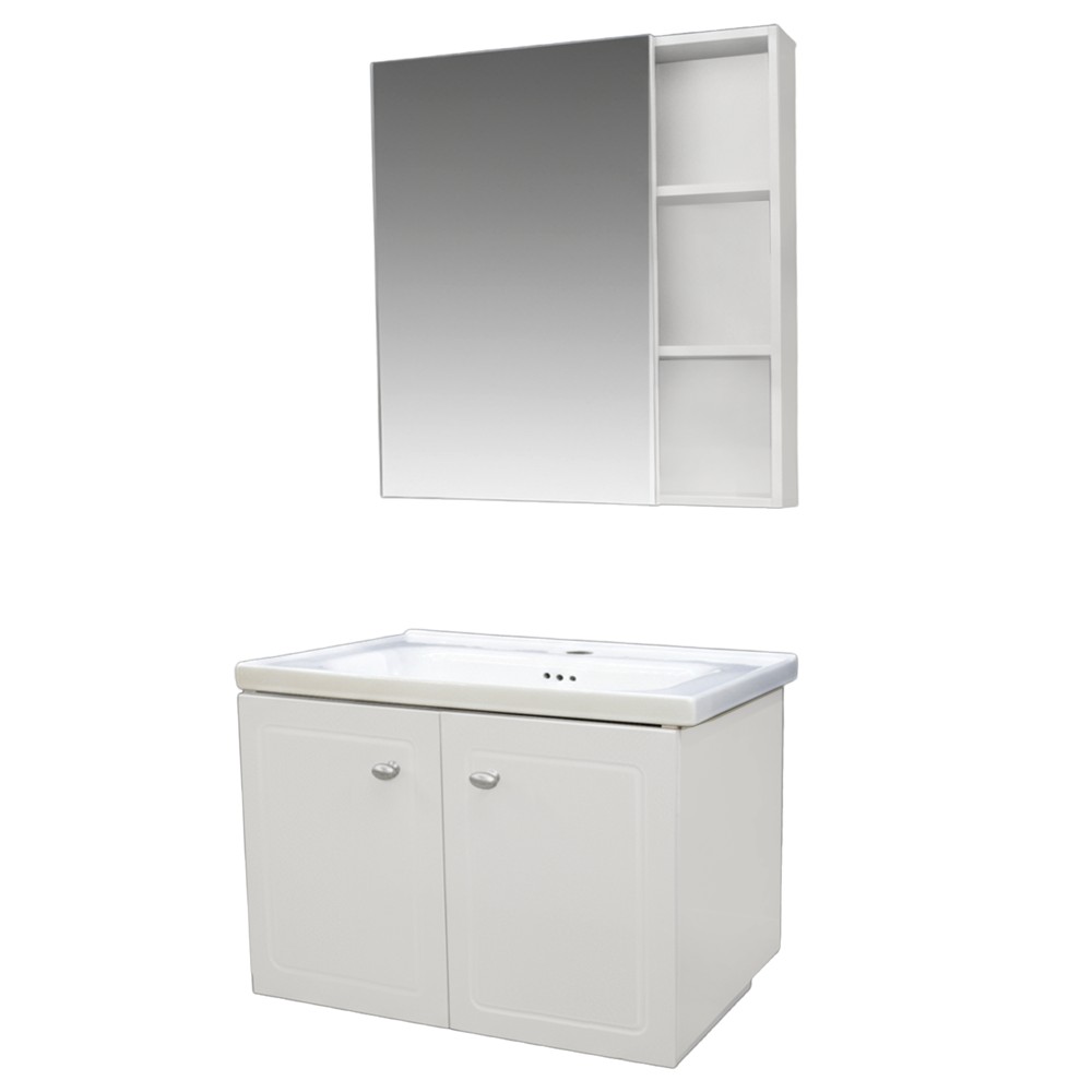 Wall-mounted bathroom furniture set, made of PVC and carbon fiber material, with compact dimensions of 80x47xH44 cm and a mirror of 70x12.5xH63 cm, designed to be moisture-resistant and with a modern style. The wall-mounted cabinet does not touch the floor, making cleaning easier and creating a sense of space, while the mirror with integrated shelves offers enough space for practical organization of necessary items in the bathroom. This design is an ideal solution for bathrooms with limited space, which require style and quality.