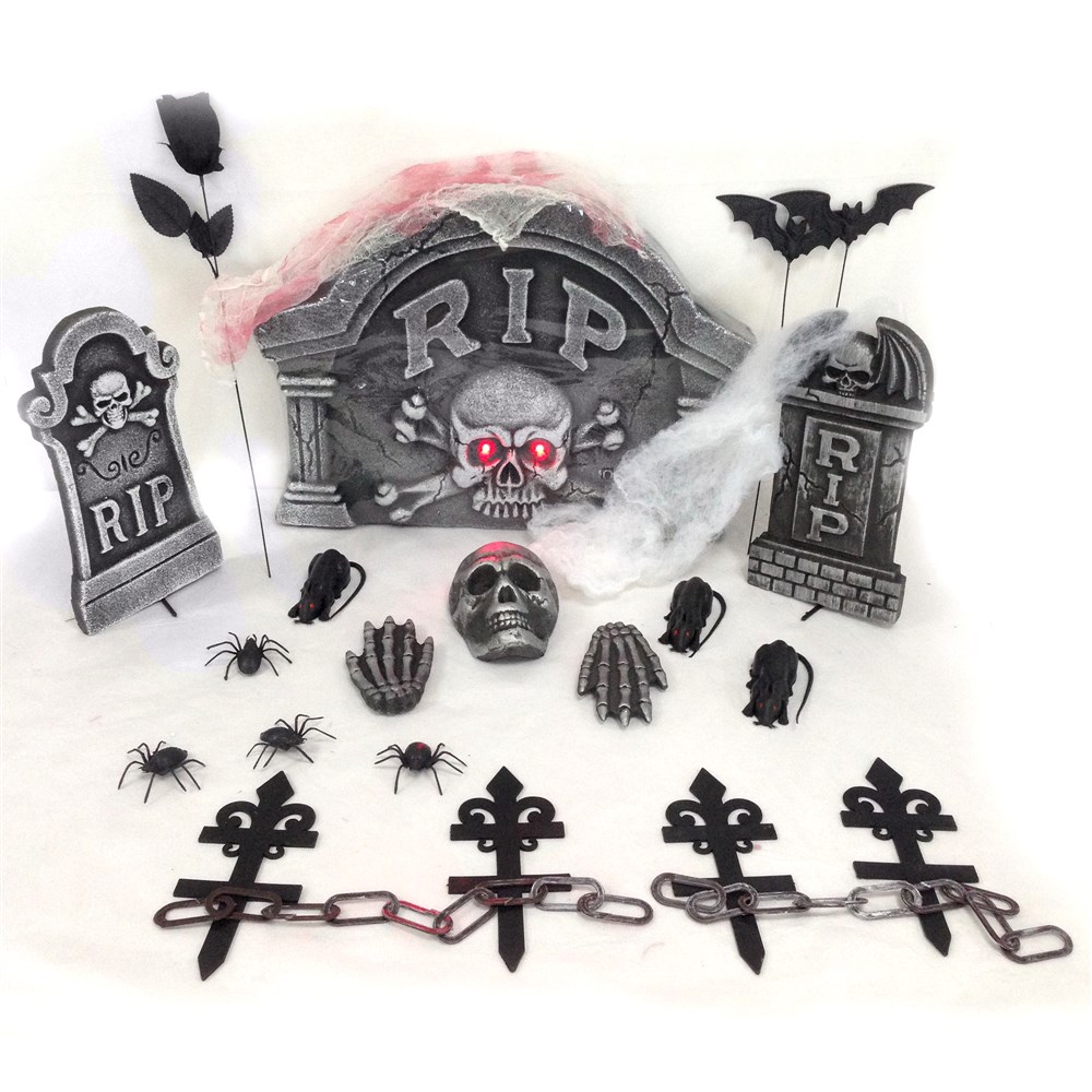 This is a spooktacular kit collection which contains everything you need to create the perfect cemetery scene. The set includes that large tombstone as well as two small ones along with a skull, a pair of skeleton hands, a couple of spiders, a couple of rats as well as roses, moss, small fencing and spider web, to complete the look perfectly.Tombstone made with thermocol and other parts are made with plastic.