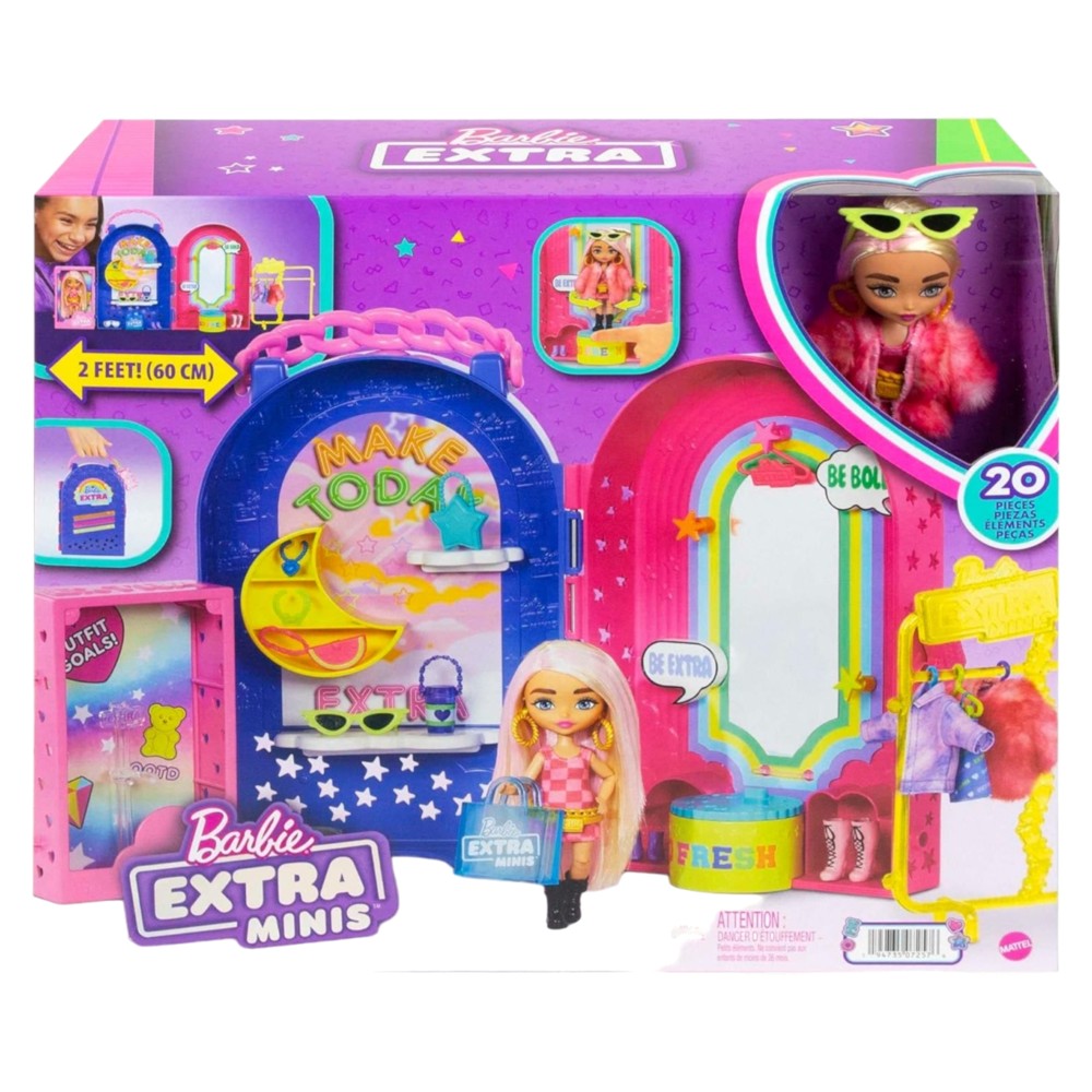 Designed with attractive aesthetics and features, the Barbie Extra Minis Boutique has all the play and display areas a fashionable doll could dream of. Immerse yourself in a boutique shopping experience with multiple play areas and 15+ pieces, offering style, storage, portability and transformative play. It also includes an exclusive Barbie Extra Minis doll. She's extra in a pink faux fur coat and plaid dress with black boots. The closed boutique unfolds to 60 cm wide and has a handle for portability and play on the go. The dressing room includes a rotating doll stand, full-length mirror and hanging star knobs. Half moon and cloud shaped shelves are perfect for storage and display. Additional styles and accessories include a tank dress, denim jacket, two pairs of shoes, two handbags, two necklaces and 2 sunglasses.