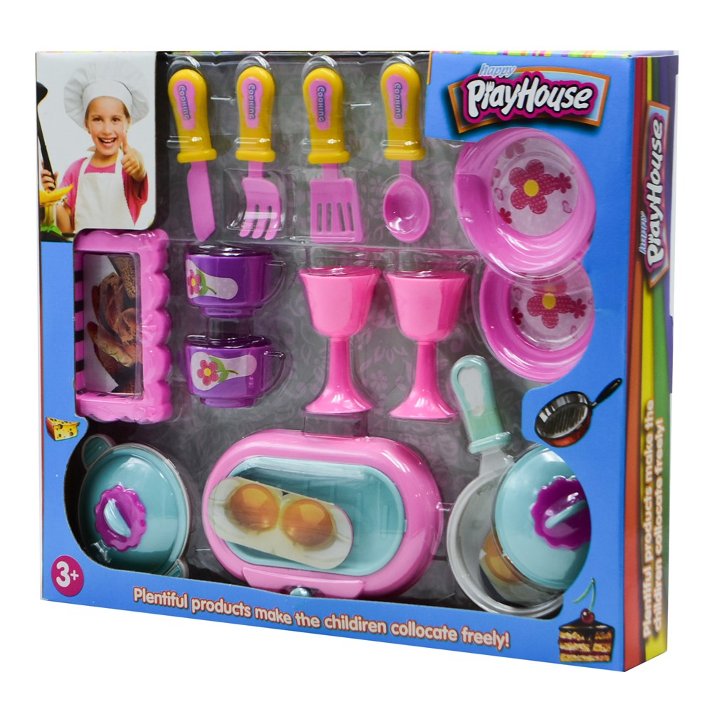 Children's toy set, with kitchen accessories, which contains a knife, a fork, a spoon, a pan, 2 tea cups, 2 plates and other accessories. This toy helps to develop imagination, it develops fine motor skills of the hands and fingers, it stimulates the development of the sensory skills, as well as it helps to improve learning and perception skills in children, through role play. The constituent material and paint have no content that can be toxic or harmful for children and the product is certified for safety in use. This product is suitable for use by children over 3 years of age.