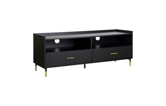 TV cabinet in black with modern design. There are 2 closets and 2 shelves to organize your things. It has 5 metal feet in gold and black and handles to open the drawers in gold. The furniture is made of mdf wood and has 2 holes on the back for cables.