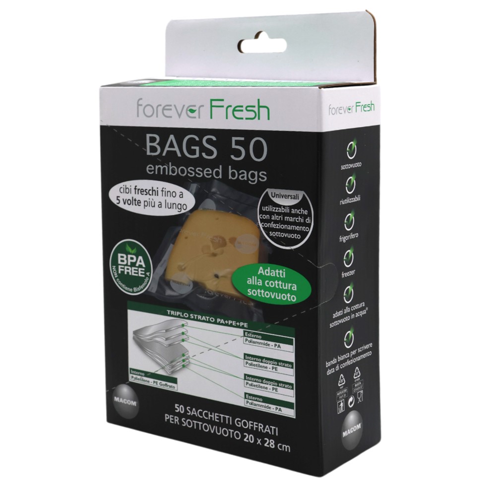 These storage bags keep food fresh up to 5 times longer, guaranteeing freshness and saving money. Storage bags can be used in the refrigerator or freezer, cooked in a double saucepan or in the microwave to thaw conserved food. Reusable and washable, even in the dishwasher. Available in a variety of sizes to satisfy every need and they can be used with other brands of vacuum sealer machines. Made in Italy.